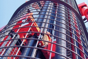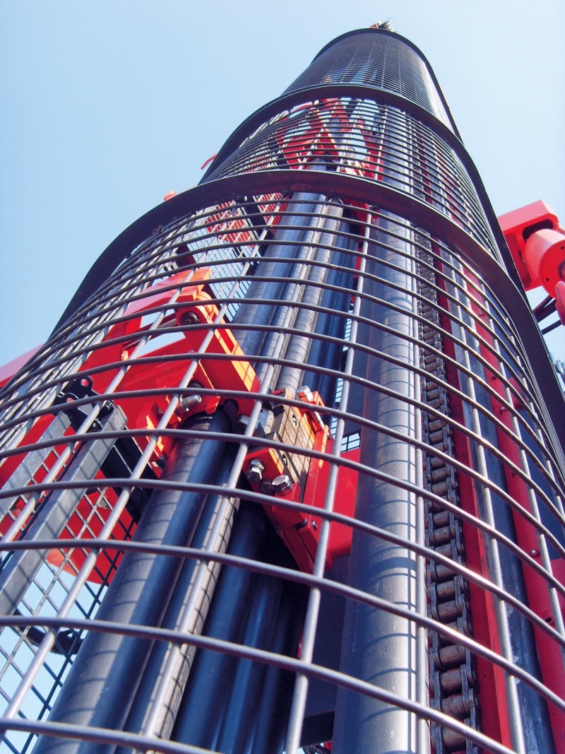 In detail, the cage protects the space at the mount from a point 500 mm from the lower drilling rod insertion or not less than 200 mm above the clamping jaw / clamping chuck. In addition, the safety cage extends at least 1600 mm upward from the lower drilling rod insertion of the mount, or at least as far as a machine operator could access the moving components. Inadvertent intrusion into the rotating parts of the drill mount will thus be effectively prevented in future, in accordance with EN 16228. In addition to “emergency stop” of the above-ground drill rig when the cabin door is opened, this safety feature is a further element of the measures being taken to ensure a long-term reduction in the number of work accidents.